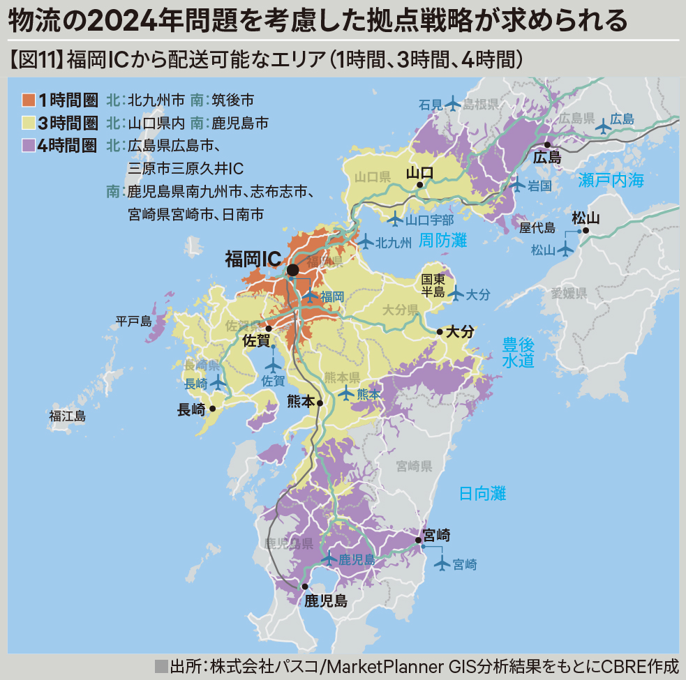 2024年4月からのドライバーの時間外労働の上限規制を考えると、運送に充てられる時間は片道3〜4時間です。福岡インターチェンジからは、北は広島県広島市や三原市あたり、南は鹿児島県南九州市や志布志市、宮崎県宮崎市や日南市あたりまでが配送可能とされる範囲です。ただし、積み下ろしなどの作業もあるので、限られた労働時間をまるまる運送に充てるわけにはいきません。【図11】そのため、広島までカバーしたいなら九州の北部寄りに、山口までなら鳥栖あたり、鹿児島まで運びたいなら熊本あたりに拠点を置く必要が出てきます。半導体の工場開設により、今後は電子機器や精密機器などの取り扱いが増えることも考えられます。【図9-10】以上のようなことから、九州の広い範囲で物流拠点の再配置が進行していくのかと思われます。