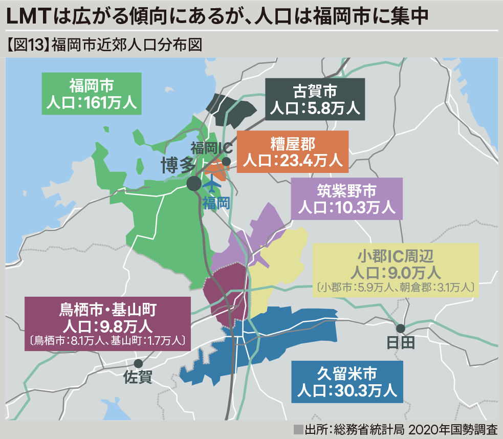 今後も九州では、土地の確保や交通アクセスに優位なロケーションを中心に、物流拠点が増えてくると考えられます。空室率も上昇しますが、潜在的なニーズがあるので、順調に消化されるかと思います。一方、LMTをつくるのであれば、そこで働く人材を確保する必要が生じます。現状で言えば、古賀や筑紫野周辺には福岡から働きに出ている人が多く、鳥栖や小郡には久留米からの人材が期待できます。【図13】また、シリコンアイランドの中心地である熊本まで行けば、さらにその周辺から働き手が集まることでしょう。【図12】ただし、九州全体で見れば、人口はやはり福岡に一極集中している状況です。働く場である物流施設が供給されたら、おのずと各地に働き手が増えるかといえば、限度があります。物流施設を供給する事業者も人材の確保や育成に力を入れていますが、今後はその事業者を誘致する自治体など、産官学が連携しながら取り組むべき課題かと思われます。