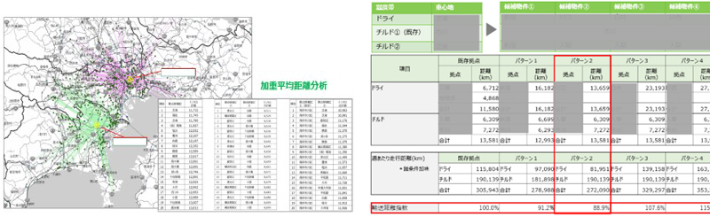 - 拠点重心地の検証から、総配送距離は約20%を削減。
