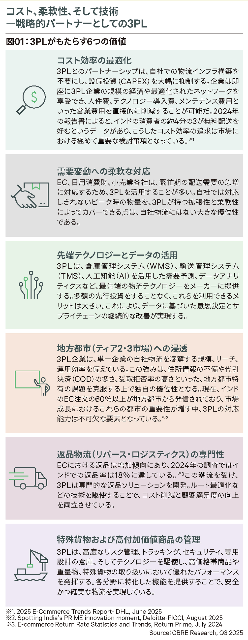 現代の物流戦略において、3PLは単なる外注先ではなく、サプライチェーン全体の競争力を左右する戦略的パートナーへと進化を遂げている。特にEC市場の成熟や消費者ニーズの高度化が進む中、自社で物流網を維持するコストとリスクは増大し続けている。そこで注目されているのが、3PLが提供する「専門性」と「拡張性」だ。本稿では、高度なデジタル技術の導入から、地方都市へのネットワーク拡大、さらには返品対応といった複雑な課題に対し、3PLがどのように解決策を提示し、企業の成長を加速させるのか、〔図01〕では主要な6つの価値を紐解いている。