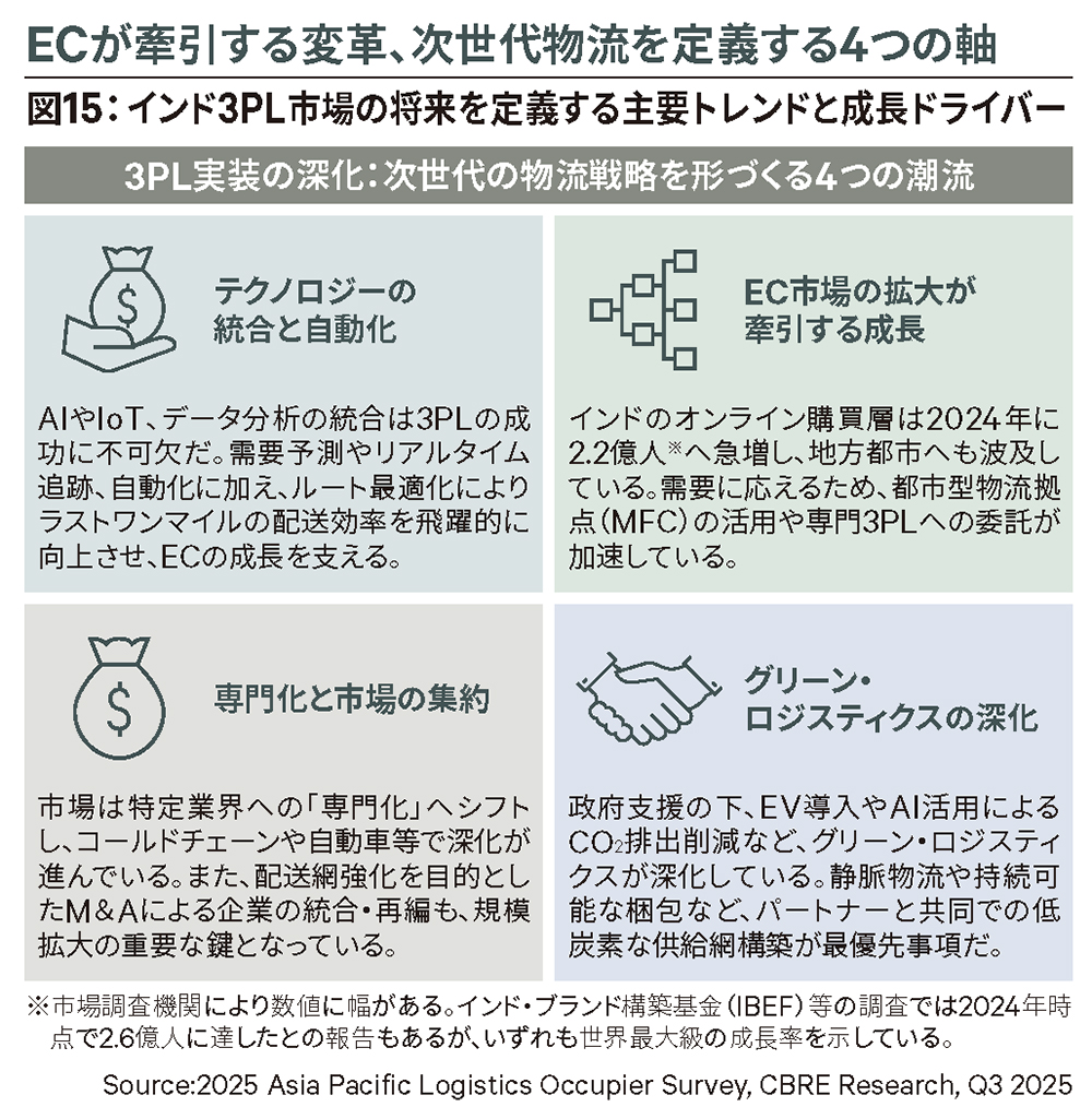 オンライン購買層は2024年に2.2億人に達し、都市部以外への普及も相まって、分散型の都市型物流拠点(マイクロフルフィルメントセンター:MFC)の需要が高まっている。また、コールドチェーンや自動車物流などの専門特化型サービスへのニーズが強まる一方、ESGへの対応も急務だ。物流効率化を促す政府のインフラ政策(PM Gati Shakti)の下、EV車両の導入やエネルギー効率の高いグリーン倉庫の整備が、企業の長期的な競争力を左右する要因となっている。〔図15〕