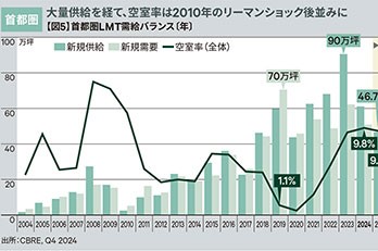賃貸施設である物流不動産は必要に応じて、必要な場所で利用でき、需要の変化に柔軟かつ迅速に対応できることから、過剰な設備投資をすることなく整備することができたため、これらのニーズに応え、急速な市場拡大を成し遂げた。2013年末には約202万坪であった4大都市圏の稼働床面積は、2024年末には約952万坪にまで拡大した。稼働床面積は需要とみることができ、引き続き、需要は拡大している【図2】。