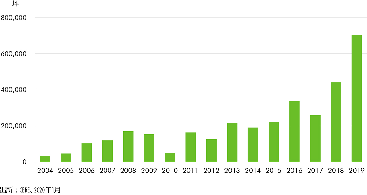 2019年は、物流施設の需要が大きく伸びた年となった。首都圏大型マルチテナント型物流施設(LMT=LargeMulti-TenantProperties)の新規需要は、2019年は年間70万坪を超えた。これは、2018年の新規需要の1.6倍にあたる。さらに、未竣工の物件でもテナントの内定が進んでいる。2020年に竣工予定の首都圏LMT43万坪のうち、入居テナントが決定または内定した面積は49.7%と、約半数に達している(2019年Q4時点、CBRE調べ)。このように、物流需要は過去最大の盛り上がりを見せていると言っていい。