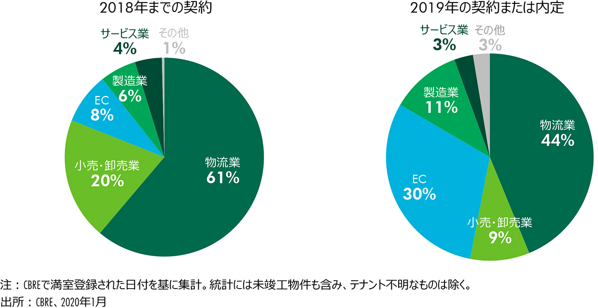 一方、2019年中の契約または内定テナントをみると、eコマースの占める割合が30%に大きく増えた。物流業の割合は44%と依然としてシェアがもっとも高いものの、需要の主役はeコマースに移りつつあるといえよう。