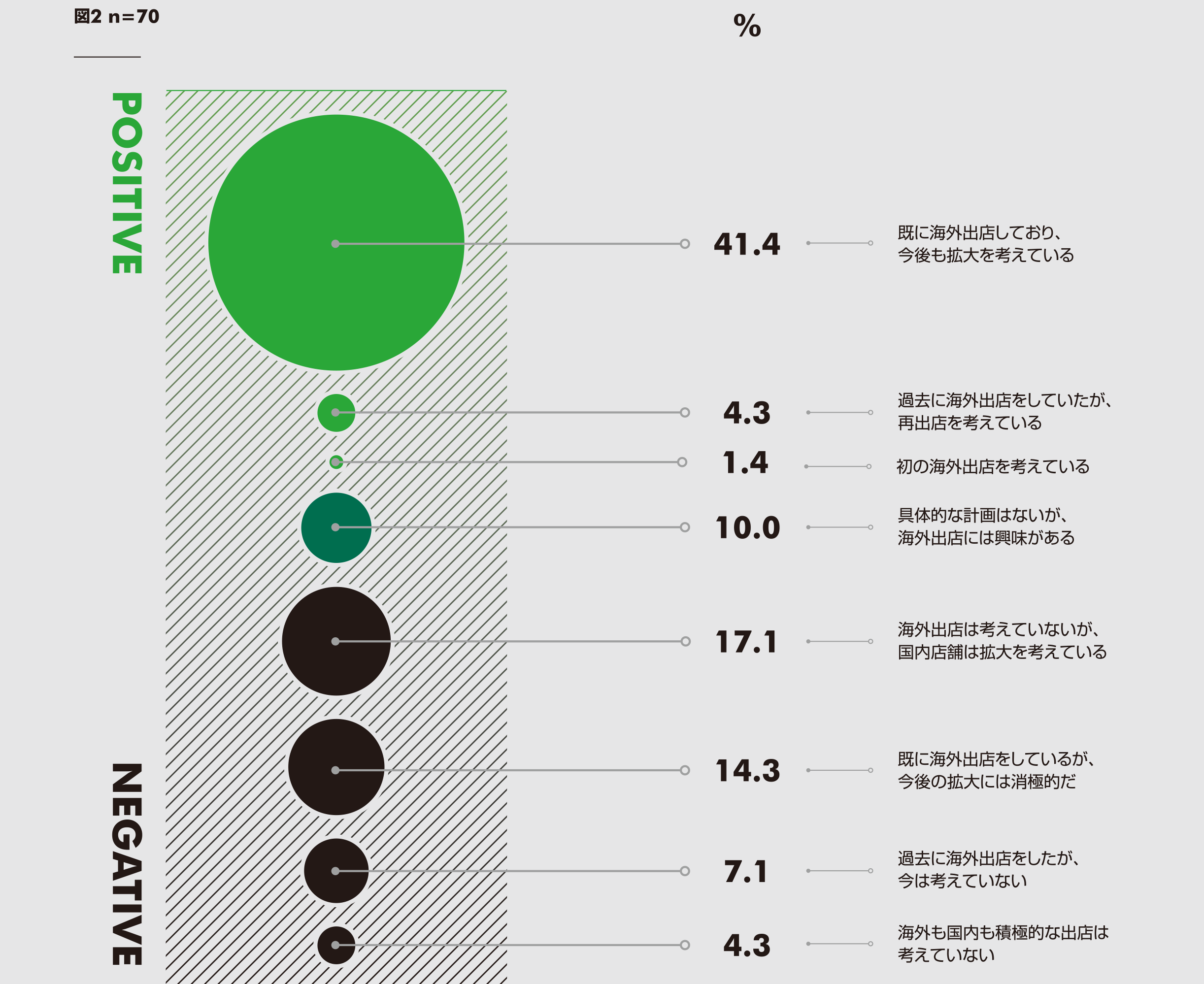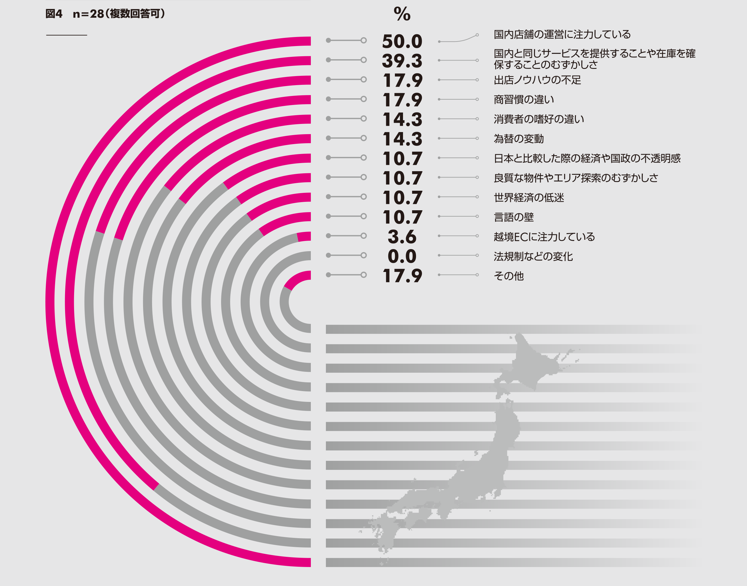 一方、「既に海外出店をしているが、今後の拡大には消極的だ」というリテーラーも14.3%となり、文化や商習慣が異なる海外での店舗運営の難しさがうかがえる。