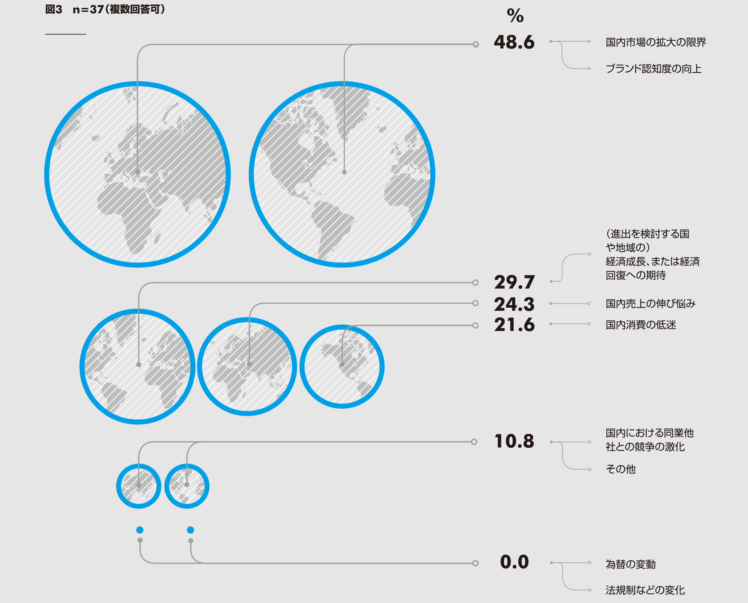 1-1の設問で海外への進出や店舗の拡大に対して前向きな回答をしたリテーラーに、その理由を訊いた。「国内市場拡大の限界」と「ブランド認知度の向上」がそれぞれ48.6%と最も多い結果となった。