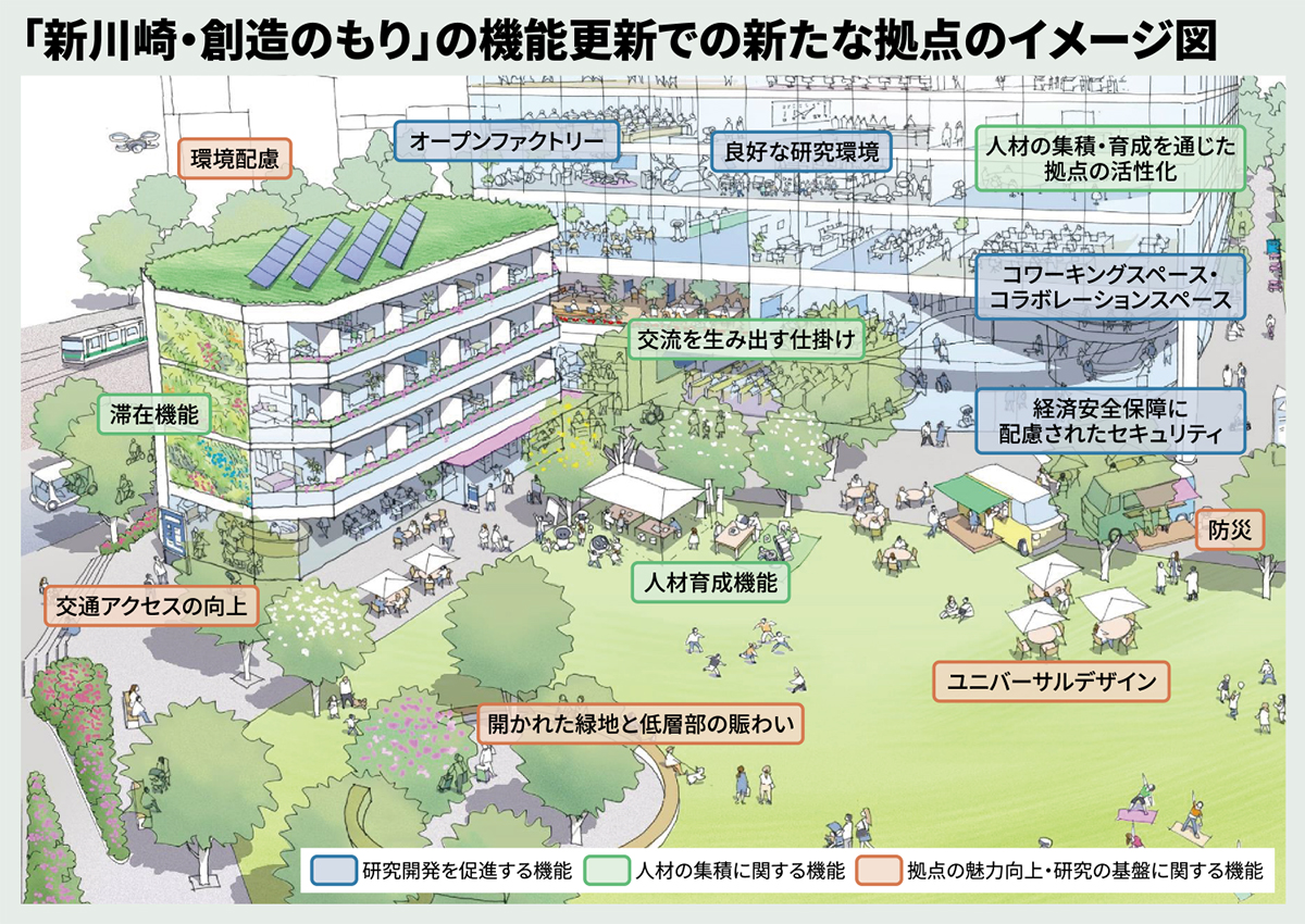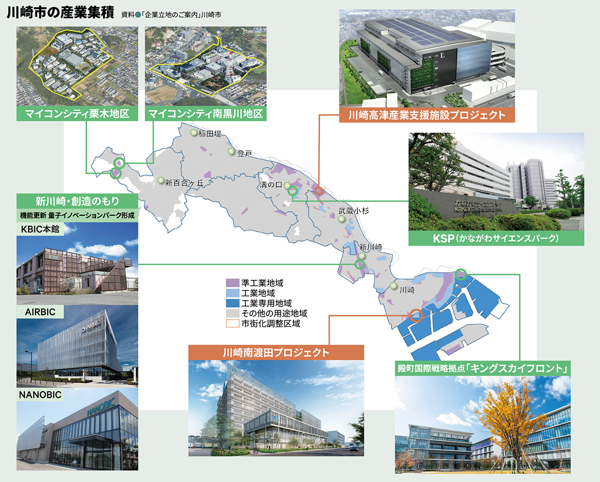 市内の産業集積地としては、2000年、新川崎の操車場跡に慶應義塾大学などのアカデミアをパートナーとする、産学官連携による研究開発拠点「新川崎・創造のもり」を整備しました。また2010年には、臨海部(殿町)のいすゞ自動車工場跡地に、ライフサイエンス・環境分野を中心とした、オープンイノベーション拠点「キングスカイフロント」を整備しています。さらに2027年には、臨海部(南渡田)のJFEスチールの研究所敷地を利用転換し、マテリアル(素材)産業を中心とした一大R&D拠点が民間主導で整備される予定です。