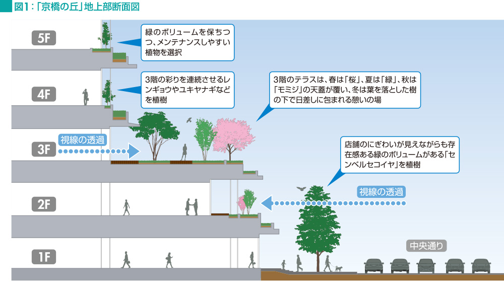 ビルの前面に立ってまず印象的なのが、緑に彩られた特徴ある低層部。地下駅前広場から重層的に連続する高さ30m、約3,000㎡に及ぶ大規模な緑化空間には、140種類もの植栽が配置され、「京橋の丘」と名付けられた。もともと当ビルの立地する中央通り沿いには街路樹がないため、周辺の街並の高さまで緑豊かな空間を提供する京橋の丘はエリアのオアシスとして注目され、春は桜、秋にはモミジが来街者の目を楽しませる【図1】。