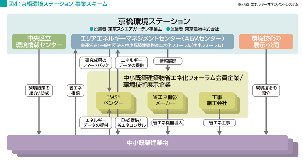 地域全体のCO2を削減するには、個々の人々、個々の建物といった小さな単位での省CO2化の取り組みが欠かせない。京橋エリアを含む東京都中央区のオフィスビルから排出されるCO2の約75%は中小規模ビルによるもので、改正省エネ法における定期報告書や中長期計画書の提出は義務ではなく任意となっている。これら既存の中小規模ビルでは、ビルオーナーの省CO2に対する意識や、エネルギー消費の特性・要因が千差万別であるため、大規模ビルに比べて省CO2対策が難しい状況にある。