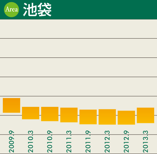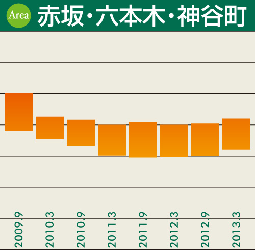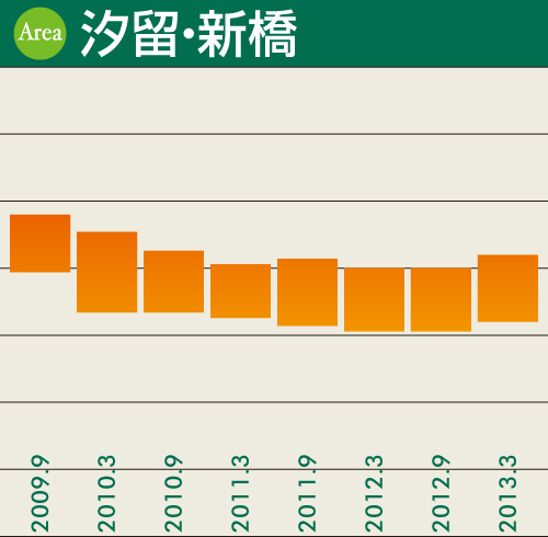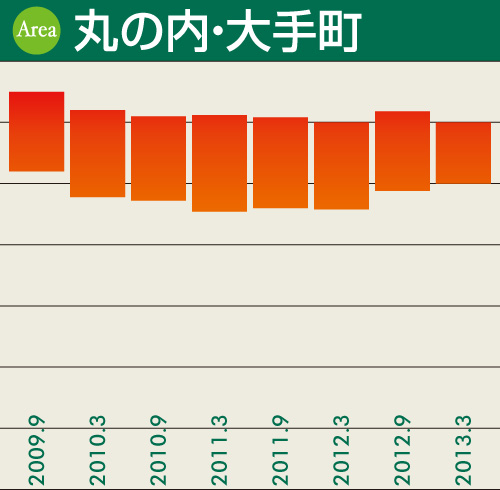 エリア毎の賃料相場の高い・安いは、個々のグラフを見て読者ご自身に判断いただくとして、ここで注目してもらいたいのは賃料相場の推移である。特にリーマンショックからの相場下落期と、昨今の景況感が反映される2012年末〜2013年初めの、グラフ右端の動きがポイントとなろう。