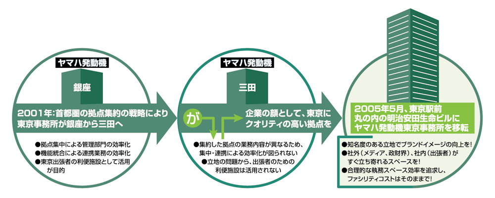 これが大きな引き金になり、03年12月には本格的に移転を考え始めました。まず社内外の声を集めた結果、当該ビルは最寄り駅から遠く、関係団体から離れているなど立地が不便。静岡に本拠を置く当社にとって、本社―東京の社内コミュニケーションの面からも利便性が劣り、地名のブランディング効果を含め、ロケーションに問題があると分析。それに基づいて、東京の中心地にヤマハ発動機の顔となる拠点が必要という結論を導き出し、「ロケーションの知名度を活かしたヤマハブランドのイメージアップ」「社内外のステークホルダーがいつでも容易に訪問できる環境の提供」を目指した、本格的な移転先探しが始まったのです。