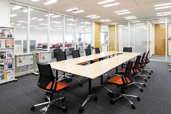 オフィスづくりのポイントとしては「感動創造企業」をスローガンに掲げる当社らしさを前面に、しかも丸の内という立地ブランドや、ビルグレードに見劣りしないよう、色・デザイン・仕上がりには徹底的にこだわっています。例えば事務機器メーカー3社により内装、デザイン、什器家具のコンペを行い、その中から当社に最適と思われるメーカーを選定。このこだわりは、天井まで届く特注のドア、明るくオープンに見せるガラスのパーティション、カラフルな机・椅子・備品などにも現れています