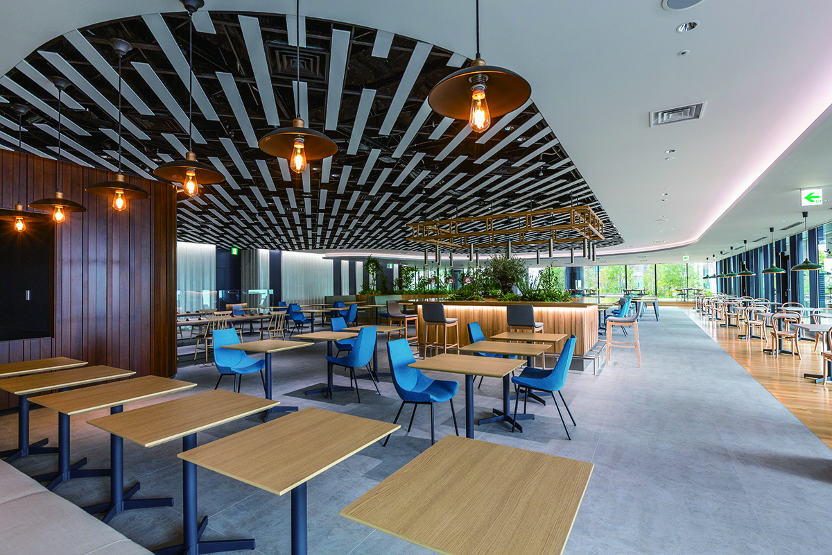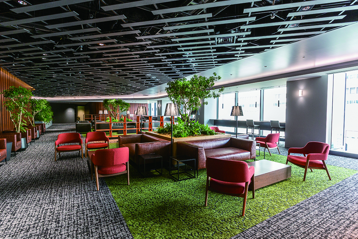 梅田の中心に建つ38階建のビルのオフィスは、フロア面積1,000坪の無柱空間。新しい働き方に対応したオフィスにするために、12階にカフェ、ラウンジ、ワークスペース、屋上広場、フィットネスなどを設けたワーカー専用のサポートフロア「WELLCO」を設けました。その他、カンファレンスゾーン、貸会議室もご用意しています。安全・安心を大切にする鉄道会社を中心とした企業グループとして、もちろんBCPにも最大限の配慮をしています。