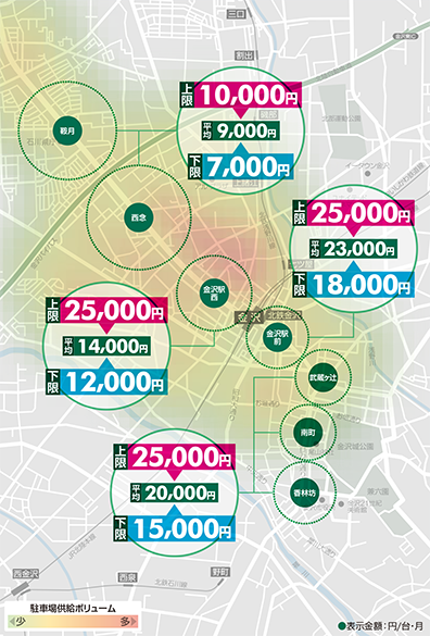 金沢は営業拠点が多いため車の必要性が高く、ビル附置駐車場と周辺の青空駐車場を併用して確保する場合が多い。特に金沢駅前は需要が高く、ビル駐車場の相場も高いことから、周辺駐車場が活用されてきた。しかし最近では、ビル内、周辺ストックとも枯渇してきている。香林坊や南町は、元々ビル附置駐車場が少なく相場も高い。