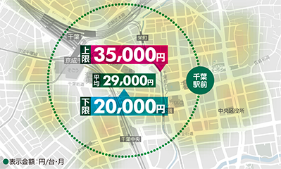 千葉駅前エリアは、千葉県内でも月極駐車場の相場が最も高いエリアで、ビルインタイプの自走式駐車場で30,000円前後、サイズ制限がある機械式でも20,000~25,000円で募集が行われている。特に京成千葉駅周辺では高単価の契約が目立ち、反対にJR千葉駅の北側では、比較的安価で駐車場を確保することが可能となる。