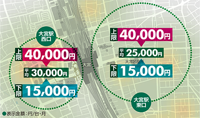 大宮駅周辺は東口、西口ともに商業とオフィスの混在エリアで、時間貸し駐車場も多く、駅近での月極駐車場確保はかなり厳しい状況となる。それでも、東口エリアの方が比較的駅近くに駐車場が点在している。