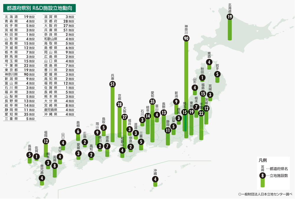 近年の企業における研究開発拠点の動向を、経済産業省が発表する「工業立地動向調査」に基づいて探ってみましょう。まず、研究開発といえば業種は製 造業なのですが、機械や化学といった業界分けや製造品目による動向の偏りは特に見られず、広く全般的に研究開発拠点の構築を進めているという印象があります。
