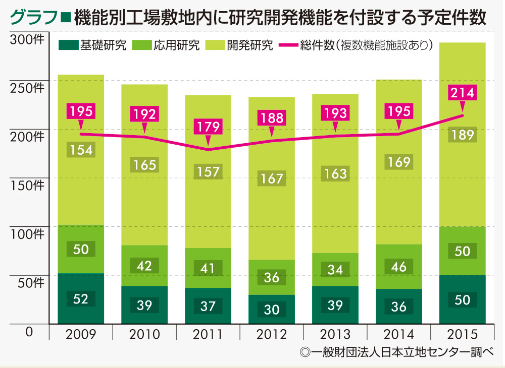 工場敷地内に研究開発機能を付設する件数を、過去7年間の総計で見ると、基礎研究が233件、応用研究が249件、開発研究が975件となっています(1拠点について複数機能を有する施設あり)。年度別にみると、2009年から各研究施設とも減少傾向となりましたが、2011年を底に徐々に回復し、2015年には総数が214件と近年では最大の件数となっています。〔グラフ〕