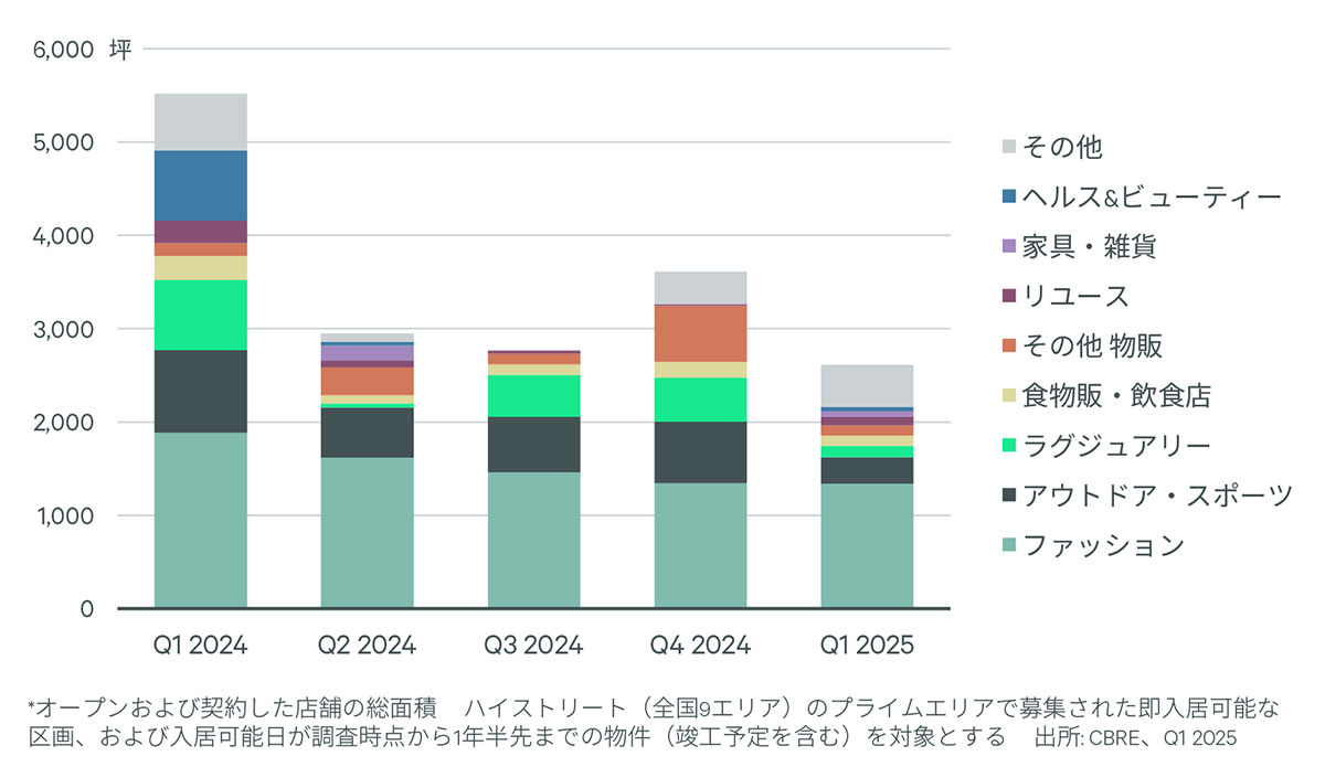今期(Q1)の全国の新規出店・契約面積は対前期比27.6%減の2,614坪。コロナ後、出店面積が増加した2023年以降では四半期ベースで最も少なく、募集区画の減少が影響した。ただし、ファッションは前期と同水準の面積規模で、前期に続き時計・メガネの出店が最も面積が多かった。複数の国内リテーラーが新宿で出店を決めたことが主因だった。