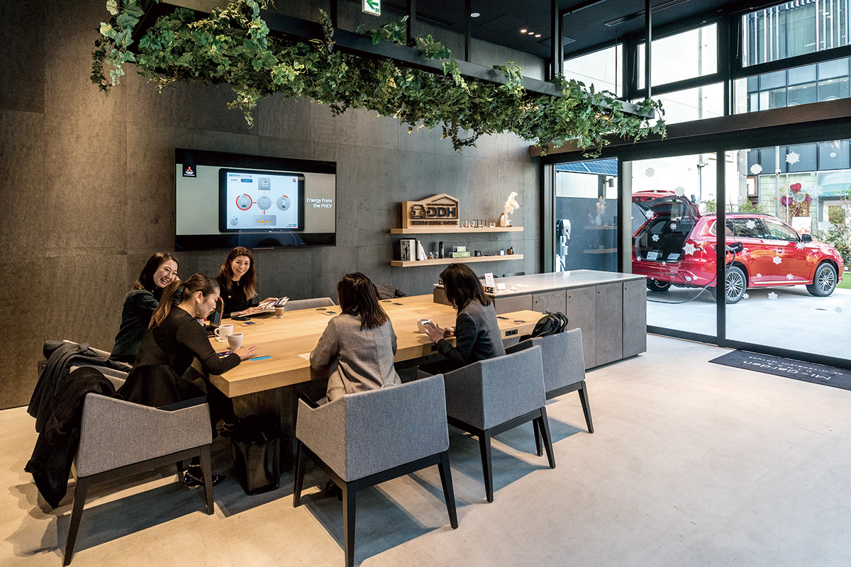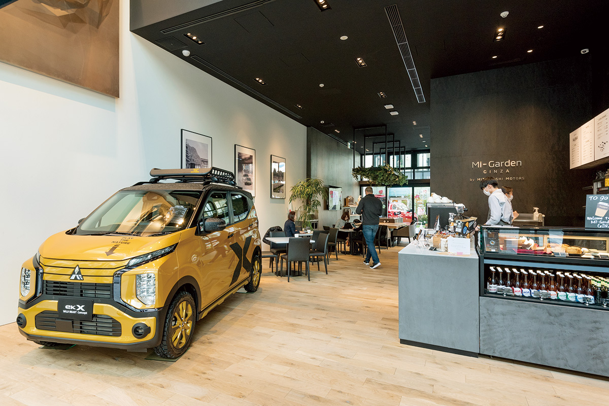 「MI-Garden GINZA」は、三菱自動車の新しいVI(ビジュアル・アイデンティティ)戦略に基づいて設計された2階建の建物で、モダンな印象を与える漆黒の外観デザインと、吹き抜けを擁するカフェが丸々見渡せる開放的なファサードが目を引く。一見しただけではここが自動車ショールームだとは気づかないであろう。しかし店内の各ゾーンにはブランド体験を提供するさまざまな仕掛けが配されており、従来ならモーターショーなどのイベントでしか観られない電動SUVコンセプトカーを展示するほか、自慢の庭に停車するアウトランダーPHEVに搭載されたバッテリーから供給される電力による、スマホなどへの充電体験やオーブントースターのような家電への給電デモンストレーション、停電時に車からの電力を家庭へ供給できる電動ドライブハウス(DDH)デモンストレーションも体験できる。また、ショールーム全体の電力には、新電力会社を通じて再生可能エネルギーを100%使用しているという。