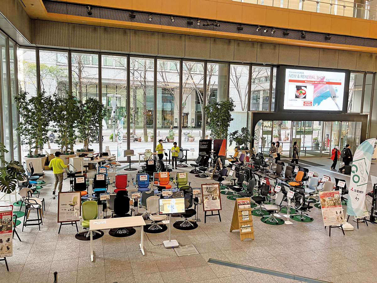 大手デベロッパーである三菱地所も、リユースオフィス什器・家具事業「エコファニ」を推進している。東京駅徒歩5分の好立地に約300坪の拠点「丸の内Base」を構え、都内を中心としたオフィステナントから厳選されたリユースオフィス什器・家具を豊富にストック。その数は、他拠点も含め約10,000点に及ぶ。「エコファニ」の強みは、仕入れたリユース什器・家具を清掃・検品し、良質な状態にして提供することだ。販売だけでなく、テナントのニーズに応じたレンタル提案や、レイアウトプランニングの提案も行う。加えて商業施設への期間限定出店「エコファニGO」、オフィス家具の清掃サービスのほか、驚くことに他社ビルオーナーを含む空室セットアップオフィス化、およびリーシング強化提案なども実施。多角的な展開を見せる。2024年10月からは事業運営を三菱地所プロパティマネジメントに委託し、この事業を通じてオフィス什器・家具のリユースを促進し、テナントへの新たなサービス提供と同時に、資源の有効活用による循環型経済への貢献を目指す。