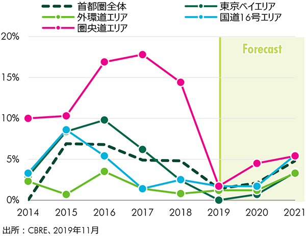 2019年は、圏央道エリアとそれ以外のエリアの空室率格差がほぼなくなった。圏央道エリアでは、直近のピークに21.2%(2018年Q3)であった空室率が、2019年Q4は2%程度まで下がる見通し。今後の圏央道エリアの空室率は、2020年まで3%から6%の範囲内で推移するとみているが、2020年後半に他のエリアに先んじて上昇に転ずる可能性がある。相対的に新規供給が多いことが、その理由である。圏央道エリアの新規供給は、2019年には9.9万坪と限定的で、それが需給改善の一因だった。しかし、一転して2020年は17万坪にも上るため、他のエリアとのテナント獲得競争は激しくなると考えられる。