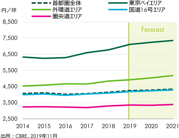 2019年の新規供給は9.9万坪と、3年ぶりに10万坪を下回った。このことも一因となって需給バランスは急速に改善、空室率は直近のピークである21.2%(2018年Q3)から2019年Q4では2%程度となる見込みである。ほかにも空室率改善の要因として挙げられるのは、国道16号エリアを含む内側3エリアでまとまった面積の空室が少なくなったことである。向こう2年間、当エリアの空室率は3%から6%の範囲内で推移するとみている。しかし、他のエリアに先行して空室率が上がること、そして2021年には隣接する国道16号エリアで大量供給が見込まれていることから、賃料は若干弱含むことも想定される。実質賃料は、2019年Q4時点で対前年同期比+1.8%の3,360円となる見込み。2021年Q4時点の賃料は、対2019年Q4比で+0.9%を予想している。