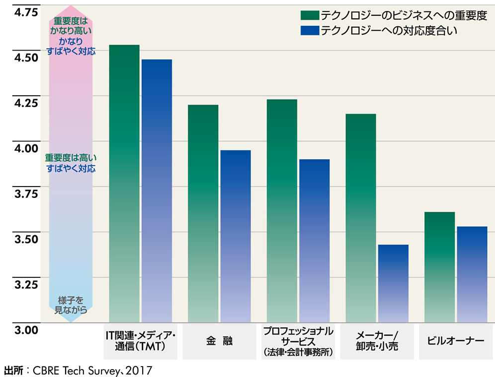 テクノロジーへの対応度合いは業種により異なっている。対応度が高いのは、まさにテクノロジーの進化を牽引するTMT(IT関連・メディア・通信)セクター。フィンテックの台頭に対策を迫られている金融も対応度が高く、R&D投資をはじめ、ビジネスインキュベーション施設の設置等を積極的に推進している。