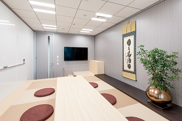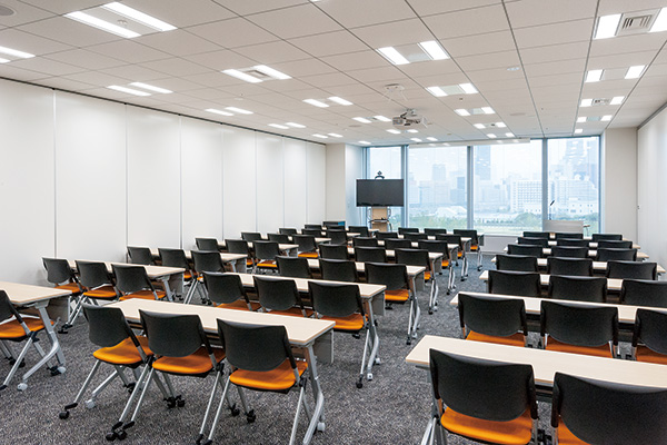 また、お客様用のミーティングルームは全8室あるのですが、そのうちの1つが100人以上が収容できるセミナールームです。当社の販売形態は代理店方式を取っているので、その方々を集めてのセミナーや勉強会に重宝しています。また、グループ全体の経営会議や全体朝礼なども、ここを利用して行います。広いスペースを取るのでその分のコストはかかりますが、社内に確保することのメリットは大きいといえるでしょう。