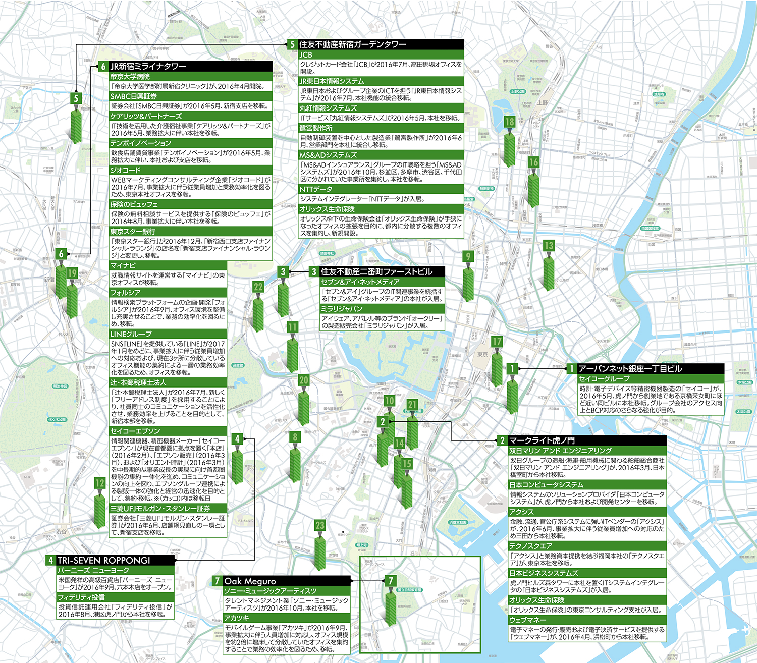 - 2016年竣工MAPでは、当該ビルに移転した企業・部門と、プレスリリース等で発表された移転理由を併記している。
