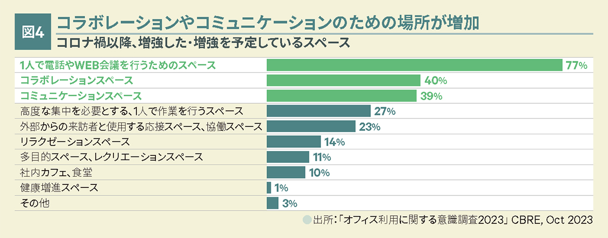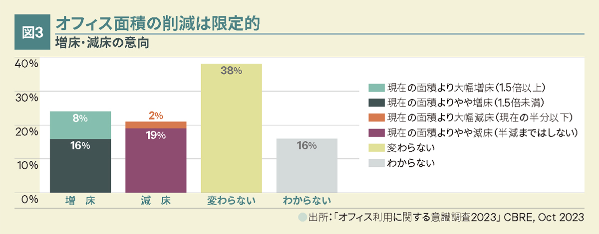 経済の回復とともに、オフィス回帰が進むと、今後のオフィスおよびその面積はどうなるのだろうか。オフィス面積の増減意向は、増床24%に対して減床21%で、やや増床意向の割合が高い。減床するとしても、一部はフレキシブルオフィスの需要に転換されそうだ。今後の執務スペース削減は限定的と見られ、削減するとしても、コラボレーションやコミュニケーションのためのスペースに転換する意向。コミュニティハブとしてのオフィスの機能を強化する意向がうかがえる。