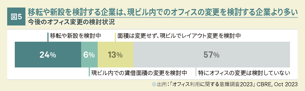 事業環境の改善見通しを背景に、現在入居中のビル内での増減床・レイアウト変更を予定する企業(19%)よりも、移転を検討する企業(24%)の方が多くなっている。