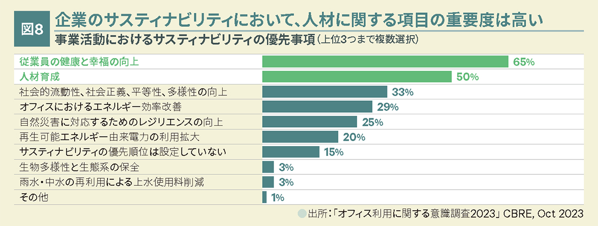 人材獲得競争が激化する中、人材は「既に持っている『リソース(資源)』や『コスト』」という前提が崩れ、経営戦略と人材戦略が一体となる人的資本経営の時代に入ろうとしている。これは、企業のサスティナビリティの優先事項からもうかがえる。「従業員の健康と幸福の向上」(65%)、「人材育成」(50%)の回答率が突出して高い。人材へ投資し、イノベーションを促進する環境を、いかにつくっていくのか。オフィス戦略はその土台として位置づけられているとうかがい知ることができる。