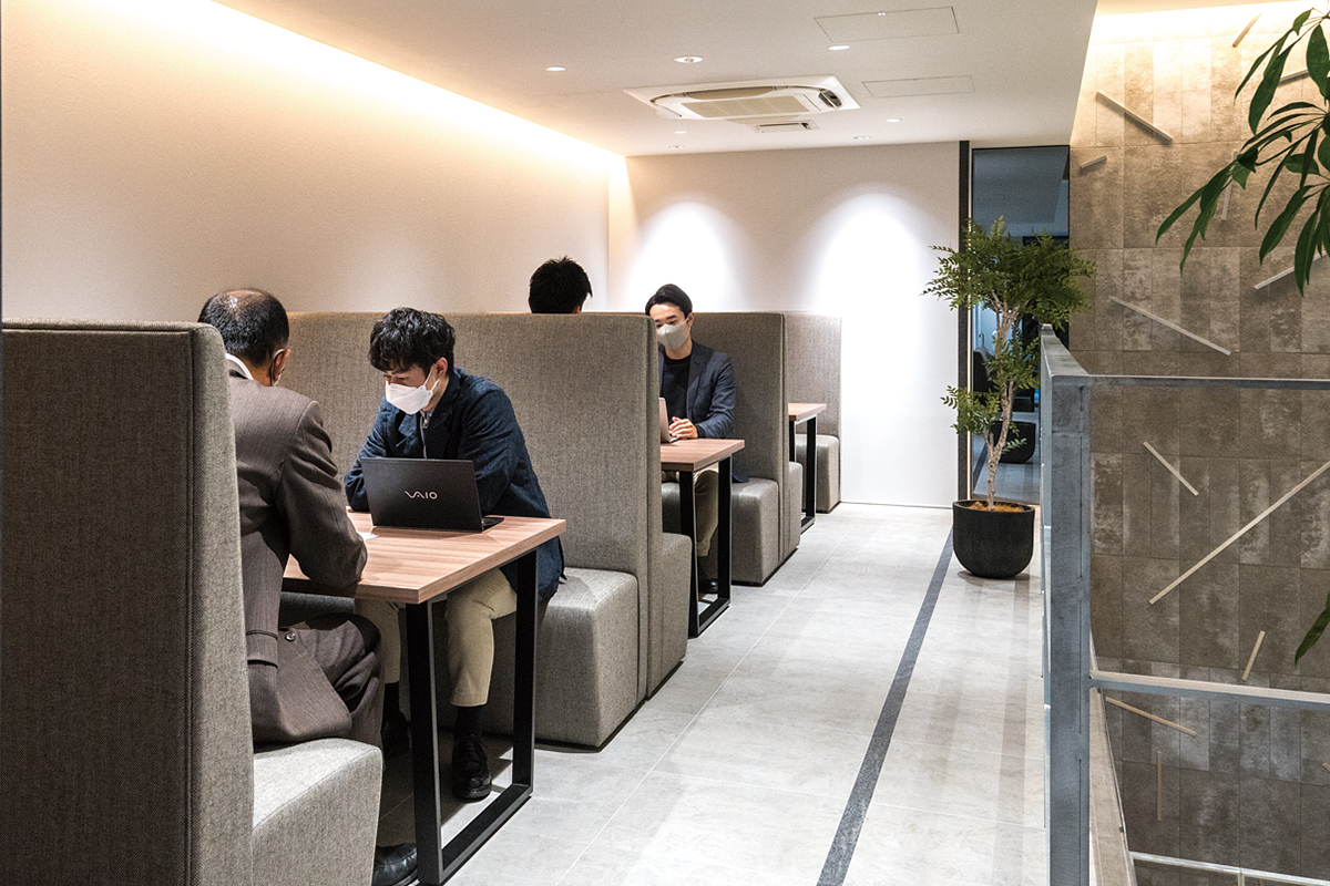 現在のオフィスで重視したのは、神戸本社と同様に物件の先進性です。立体駐車場だった建物をリノベーションした物件で、その点にも驚きましたが、他にも検討した二十数件の候補のなかで、「WorkstyleOS」を活かし、その体験を高められるオフィスづくりが可能だと判断しました。エントランスには入退管理を行うタブレット端末を置き、来社した方に呼び出していただくと、チャットツールで社員に通知が届く仕組みになっています。社内に入れば、お客さまとのミーティングなどに使えるファミレス席があり、「WorkstyleOS」による予約も可能です。社員の席はフリーアドレス制で、椅子のQRコードを読み取ることで、チェックインしたり予約もできます。また、集中して作業に取り組めるようにソロワークブースを設けたほか、会議室を一つ確保し、入退室管理にはフォトシンスさんのスマートロック「Akerun」を導入し「WorkstyleOS」と連携させています。そのほか、地下のフロアは、オフィス空間が社員の生産性や健康にどう寄与するのかなど、実証実験を行う場としても使用しています。
