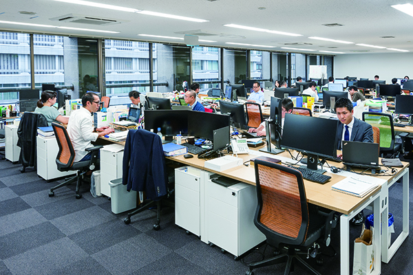 茅場町に移ってから、社員の通勤の便がかなり良くなりました。東京メトロの東西線と日比谷線が通っているので、首都圏の東西南北どの方向からもアクセスしやすいのは大きな利点です。採用数も一気に増え、そのうち執務スペースが足りなくなり、偶然空いた下の階を借り増しました。現在、約55人がこのオフィスで執務しています。