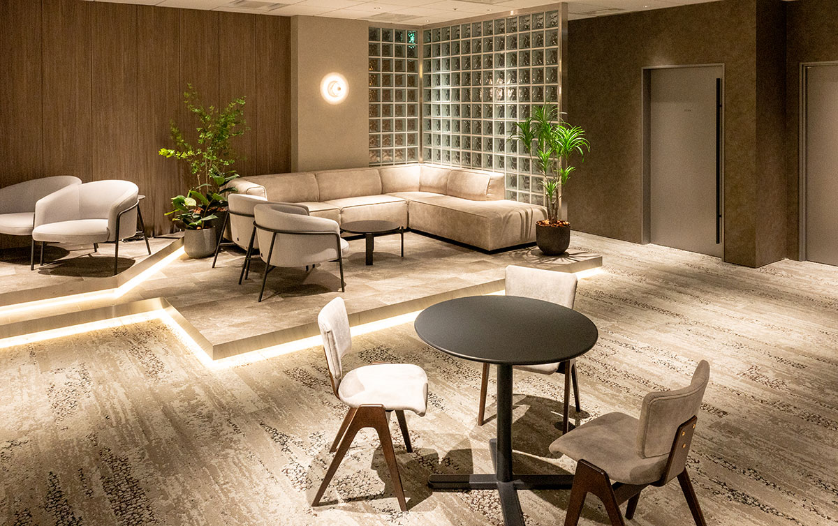 内装デザインは、あえて「温かみ」を抑え、コーポレートカラーである青やシルバーを基調とした、クールで洗練された空間を目指しました。特にこだわったのは、外部の方をお招きできるイベントスペースと会議室の充実です。現在、昼夜を問わず様々なイベントを開催しており、採用候補者やクライアントとの接点を生み出す重要な装置として機能しています。
