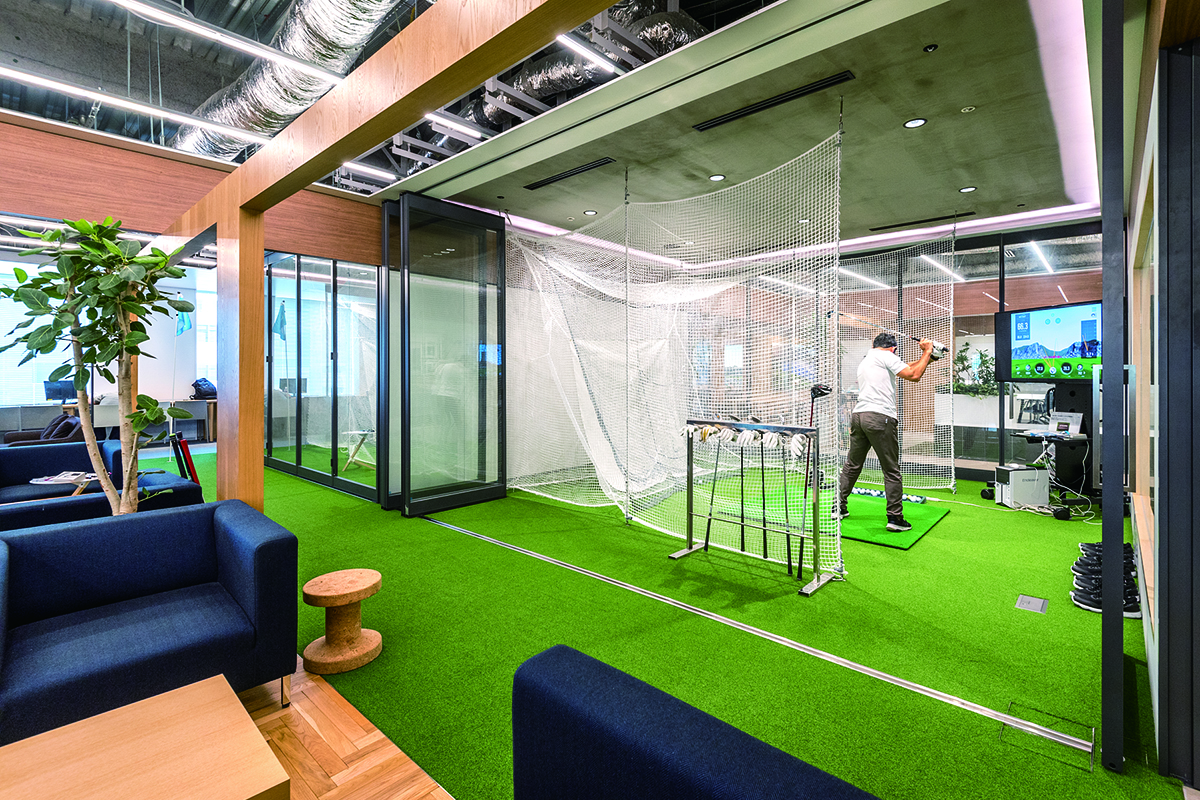 虎ノ門オフィスには、室内ゴルフ練習場も設けました。それまではゴルフメーカーと当社バイヤーが狭い会議室にこもってゴルフ商材の商談を行っていましたが、実際にシューズを履きながら、ボールを打ちながら商談できる場があれば盛り上がるだろうと思ったのがきっかけです。それを来場者も目にする受付の後ろに堂々と設置することで、ブランディング効果も生まれます。室内のゴルフ練習場は、現在のオフィスにも引き継がれています。