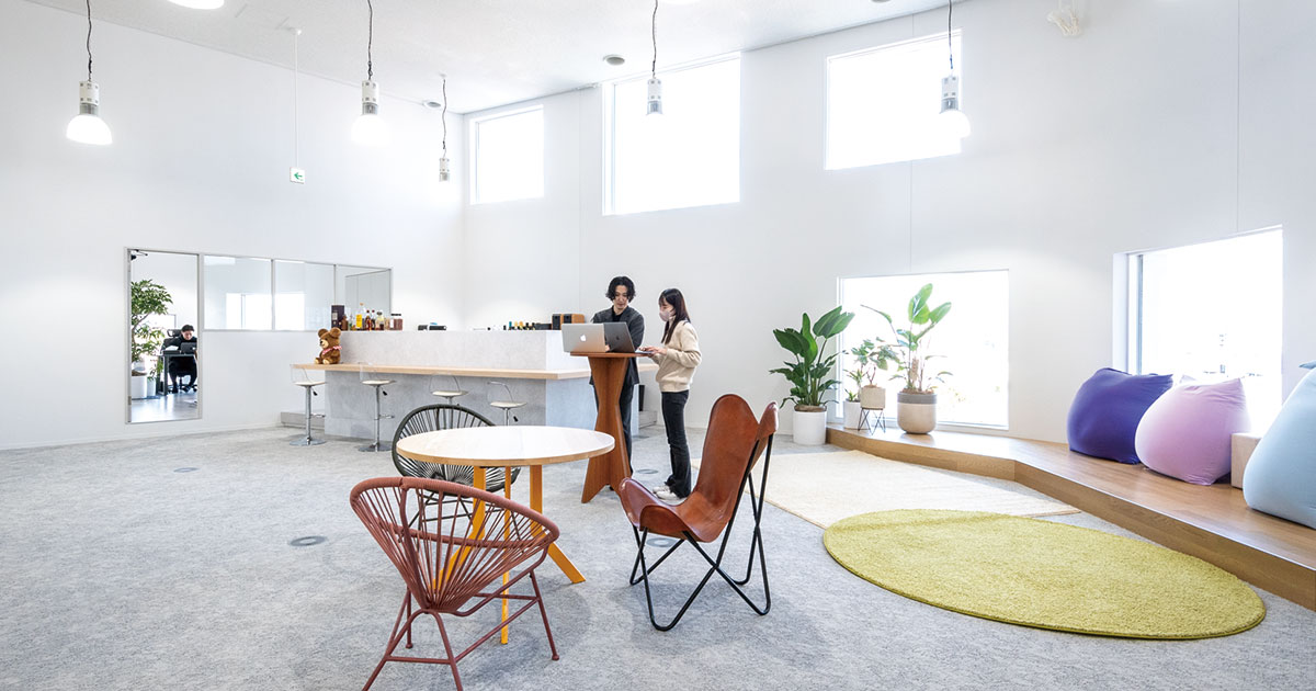今のオフィスは、以前から代表の阿部が「いつか入りたい」と考えていた物件です。100坪超で広さに余裕があり、ちょうど著名な企業が退去されたタイミングで、「これは行くしかない」と入居を決めました。オフィス全体のコンセプトは、技術や専門性、働き方など、個性の様々な美容師にご利用いただいているサロウィンであることから、「カラフル」と設定しました。全社員から募った3名のオフィスづくりメンバーが中心となり、あえて統一感を持たせない色とりどりの内装づくりや家具選びをしています。また、会議室や個人用ブースもそれぞれ4ヶ所設けたほか、何より天井が高く、オフィス全体が開放感に包まれています。