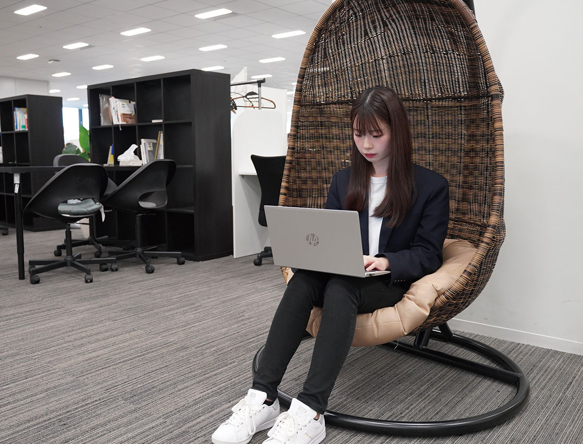オフィスづくりのコンセプトとしては、「会社に来たくなること」を目指しています。社内のデザイナーと一緒に家具選びから配置決めまで、自分たちでやりました。ベンチャー企業のカルチャーは、誰にでもマッチするものではないと考えていますが、それでも多くの社員を採用することができたのは、オフィスという環境自体が魅力を備え、愛着が深まる場であるからだと思います。そのため、リフレッシュスペースは広めに確保し、メンバー同士で食事をしたり、コミュニケーションを刺激するような家具を置いてみたり。また、時には仕事の合間に、ゆったり仮眠などしてもらえたらと思い、数は少ないですがゆりかごチェアも配置しています。リモートで顔を見て言葉を交わすこともできる時代ですが、そのような場が持つ力にこだわり、メンバー一同が働きやすさや働きがいを感じられる環境を築いていきたいと思います。