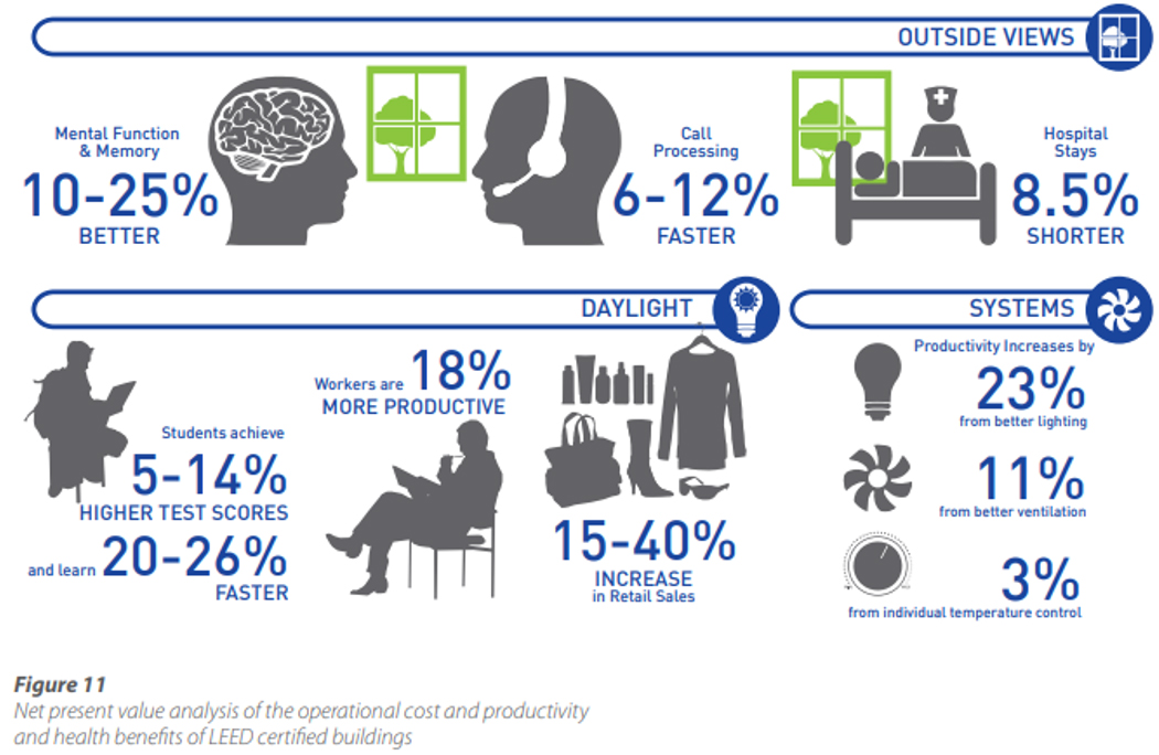 これまで数多くの研究がグリーンビルディングと労働生産性を関連づけており、Well-beingなオフィス整備のためには、計画段階からこうした観点を反映する事が重要です。