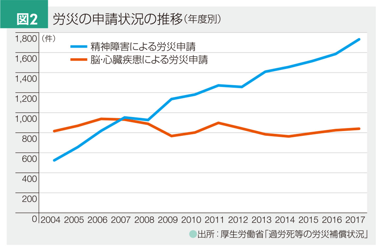 最近のオフィスでは、工場などとは違い、安全よりも衛生面での労災が重要となっています。【図1】のように精神障害での労災申請と労災として認められたという意味の支給決定件数は右肩上がりで、脳卒中や心筋梗塞などの2倍となってしまいました【図2】。労働時間が長い、または不規則、人間関係が悪い、ハラスメントがある…などの職場では、いくら快適なオフィスをつくってあげても、労災を防ぐことには直結しません。