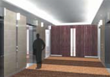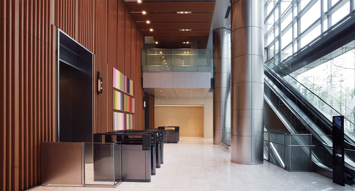 ビルのエントランスホールに非接触ICカードリーダー搭載のセキュリティゲートを設置。