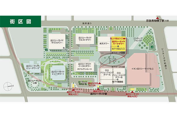 「品川シーサイドフォレスト」は、大型オフィスビル、商業施設、ホテル、高層住宅などの都市機能をバランスよく融合させた再開発エリア。公園や歩行空間などに四季折々のみどりを配した植栽により、開発コンセプトである“杜のみどりの中の街”にふさわしい快適で安らぎのある環境を実現しました。また、品川シーサイド駅との一体化、および交通広場の充実により、電車、バス、タクシー等の利便性の高い動線を確保しています。