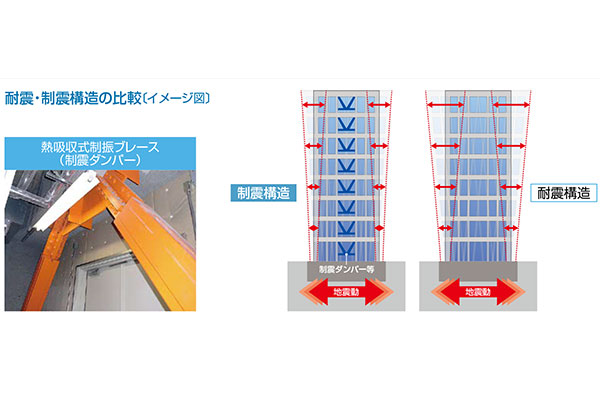 建物に作用する地震エネルギーを熱吸収式制振ブレース(制震ダンパー)により吸収して地震時の揺れを低減させ、耐震性能を高める制震構造を採用しています。