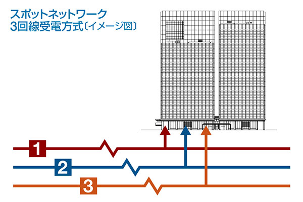 信頼性の高い受電方式であるスポットネットワーク3回線受電方式を採用。1回線がダウンしても、残りの2回線から電力供給が維持されます。