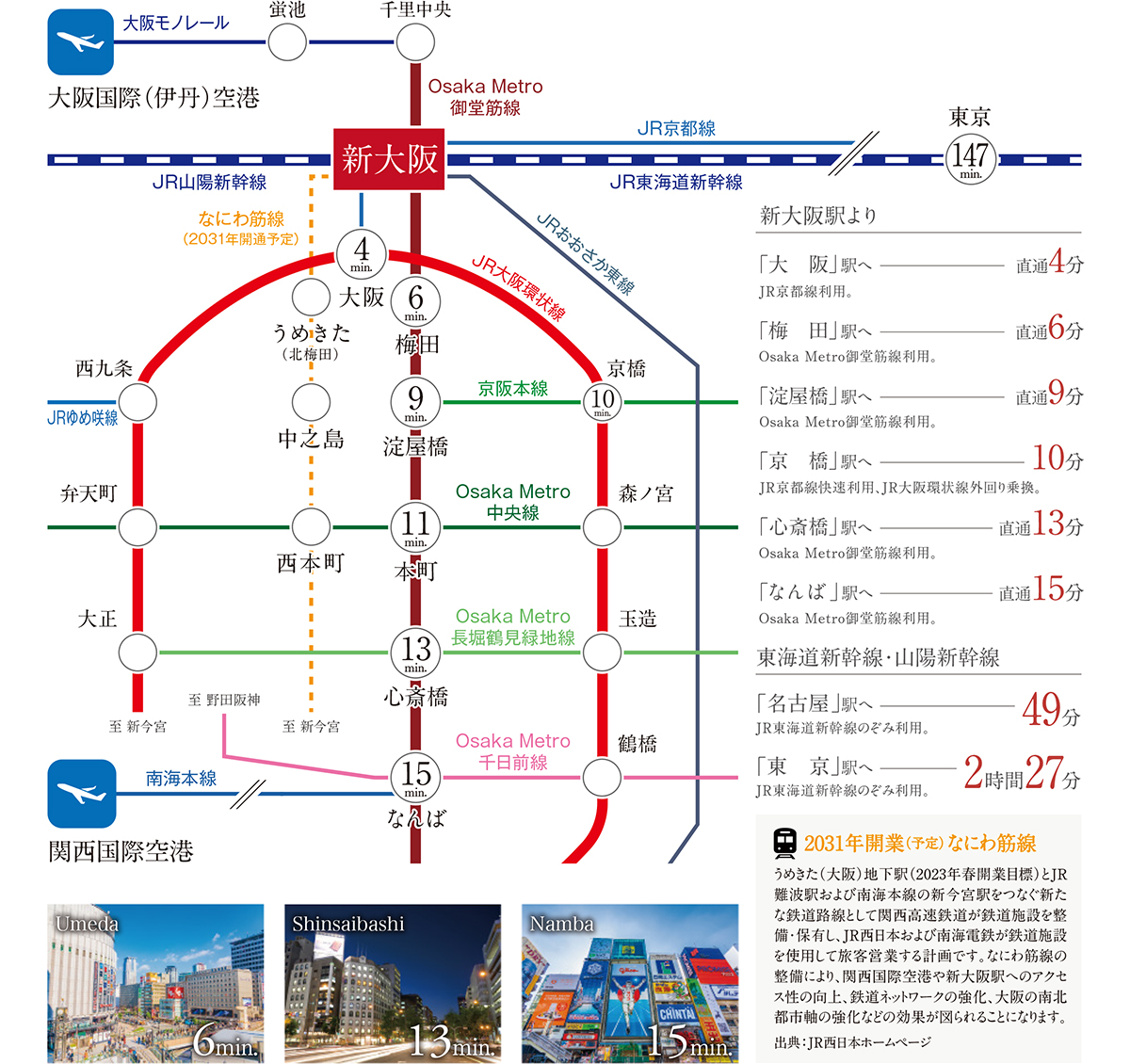 東海道新幹線、山陽新幹線、JR線、Osaka Metro御堂筋線などの4路線が利用できるマルチアクセス。 大阪を縦貫する御堂筋線からは東西の各路線とも接続できます。