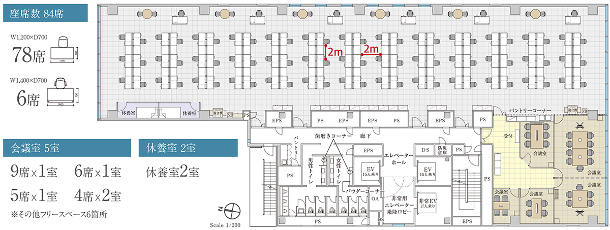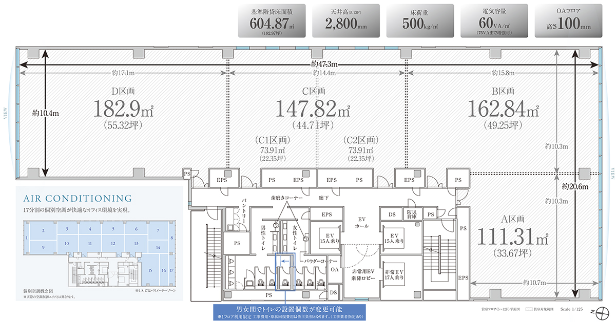 柱を壁に配置し、無柱のフロア設計や17分割の個別空調により、レイウトがしすく自由度の高いオフィスを実現しました。