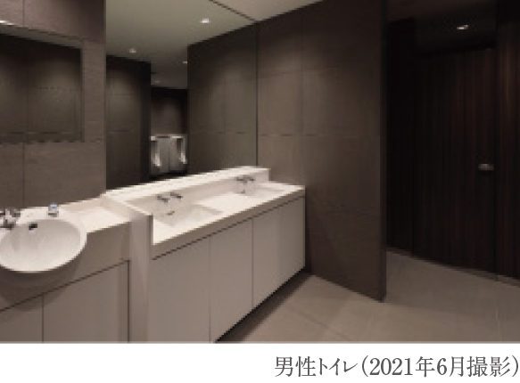 毎日使うレストルームには落ち着きのあるしつらえに歯磨きコーナーを設置。いつでも清潔に使えるよう、契約清掃会社がアメニティスペースの清掃、備品交換サービスを行います。
