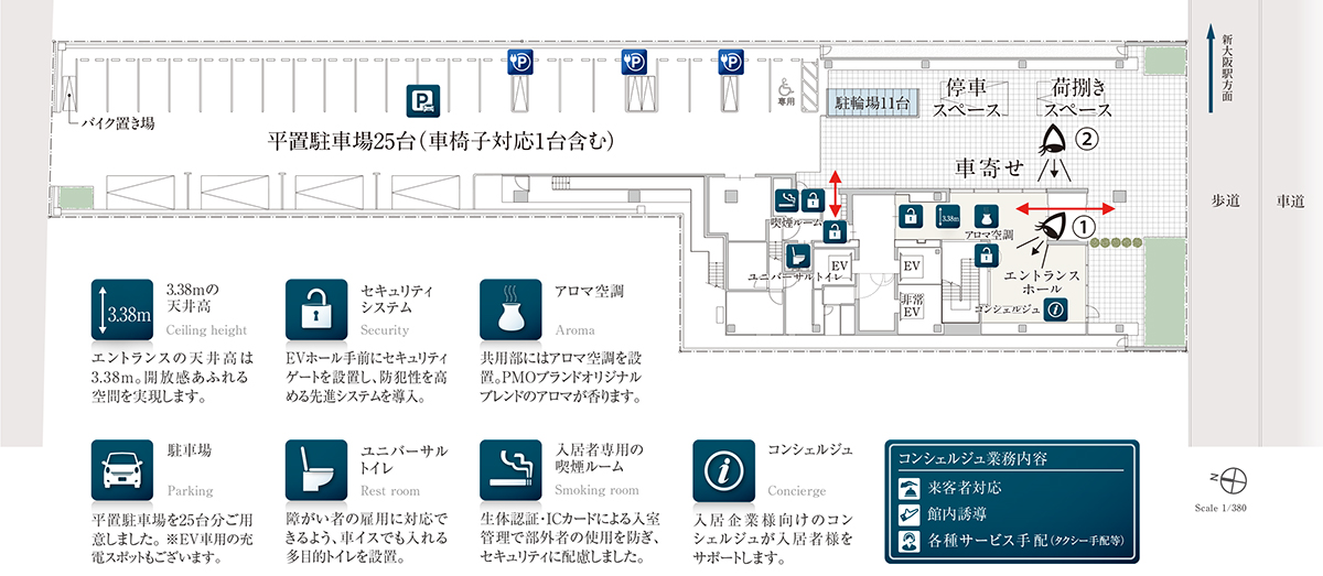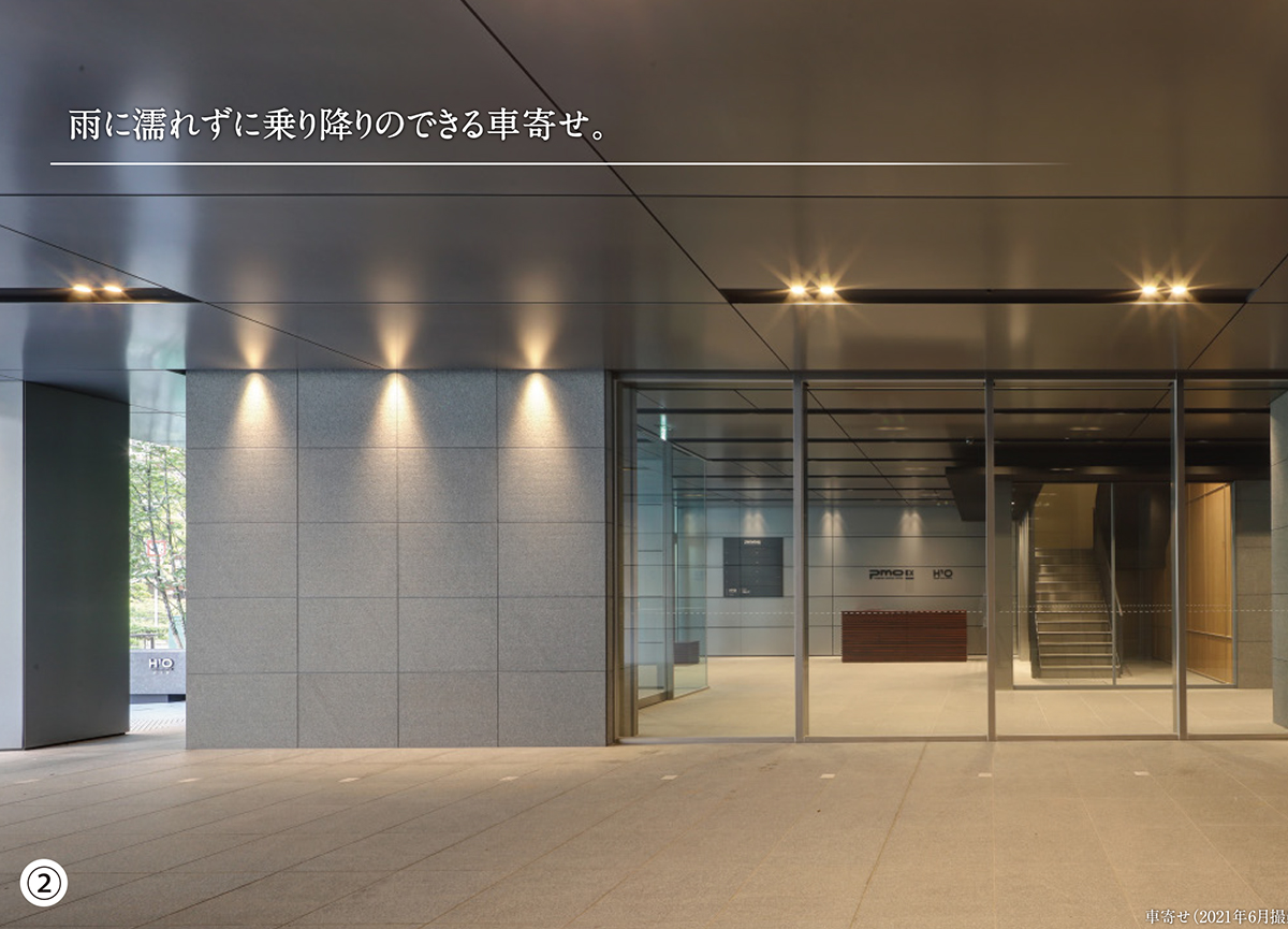 1Fにはビルのコンシェルジュが入居者を優しく迎えます。天井高3.38mの格調高きエントランスホールには、PMOブランドオリジナルのアロマが香ります。また、テナント専用の喫煙ルームやユニバーサルトイレなど、共用設備も充実しています。