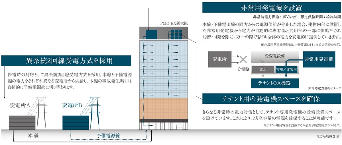 「PMO EX新大阪」では、災害時・停電時の予備電力を確保するために、2回線受電方式を採用。電力の安定供給に取り組むことで、企業の事業継続性に大きく配慮したビジネス環境を整えています。